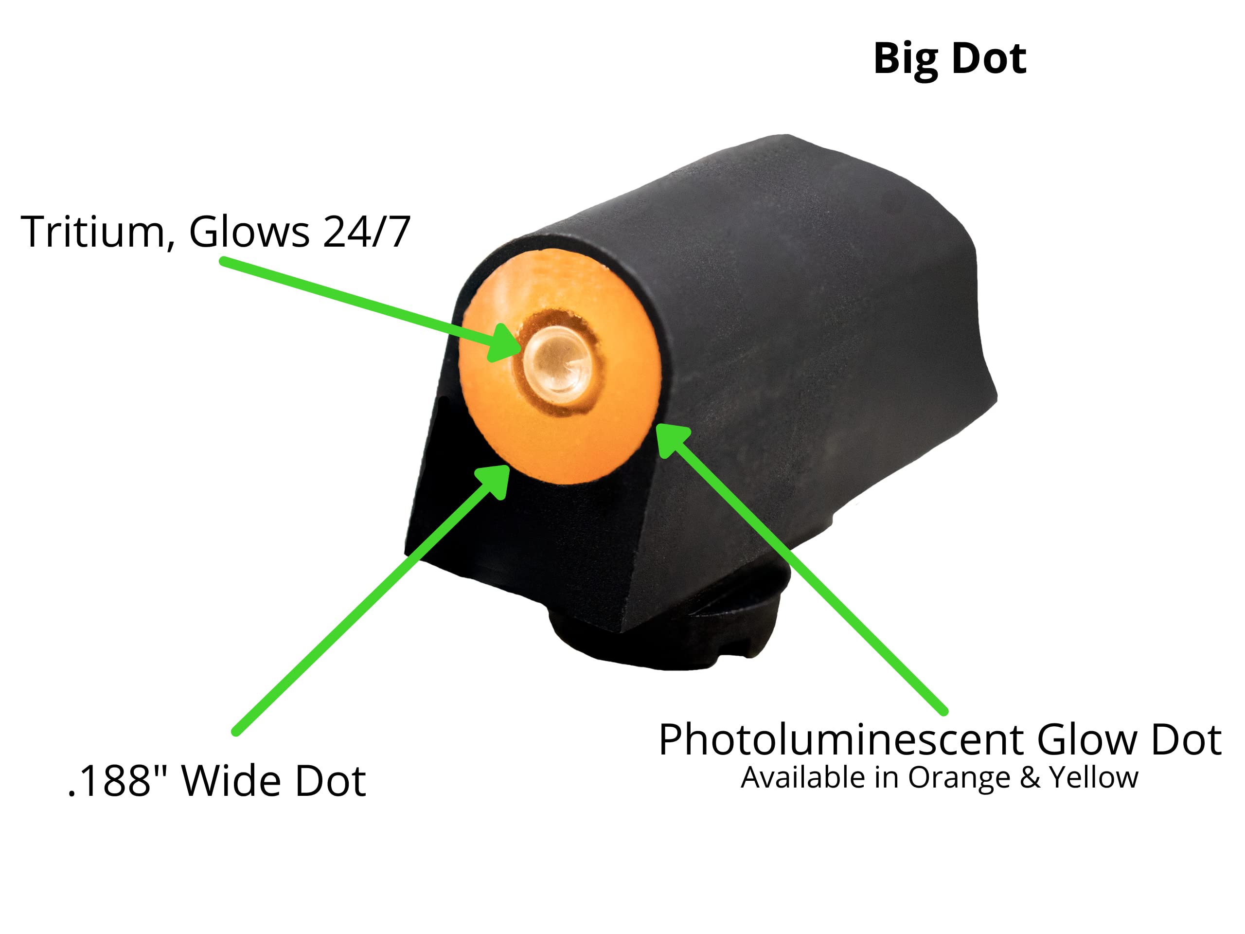 - High Visibility Big Dot Front Sight. The Big Dot Front Sight Is Available With A Photoluminescent Yellow Or Orange Glowing Dot Surrounding The Tritium Insert. Increases Visibility In All Lighting Conditions. DXT2s Offer The Fastest Front Sight Acquisition When Speed Matters.